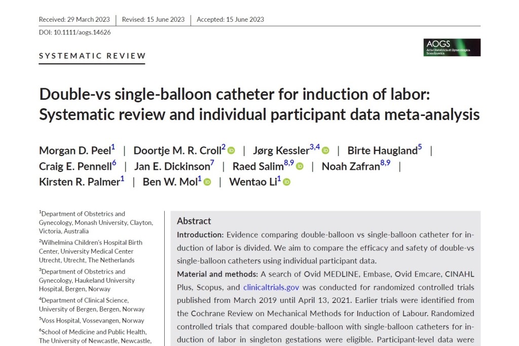 Peel, Morgan D et al. “Double-vs single-balloon catheter for induction of labor: Systematic review and individual participant data meta-analysis.” Acta obstetricia et gynecologica Scandinavica vol. 102,11 (2023): 1440-1449.