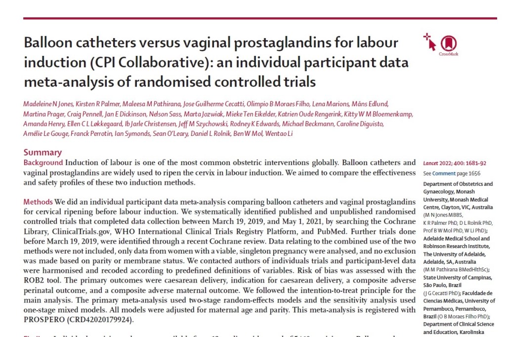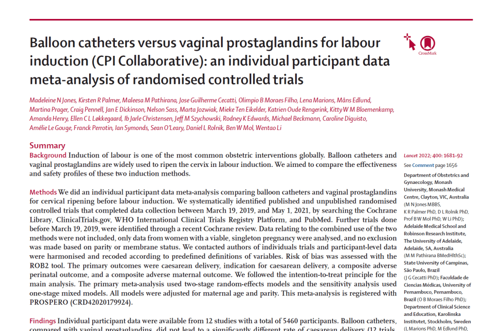 Jones, Madeleine N et al. “Balloon catheters versus vaginal prostaglandins for labour induction (CPI Collaborative): an individual participant data meta-analysis of randomised controlled trials.” Lancet (London, England) vol. 400,10364 (2022): 1681-1692.