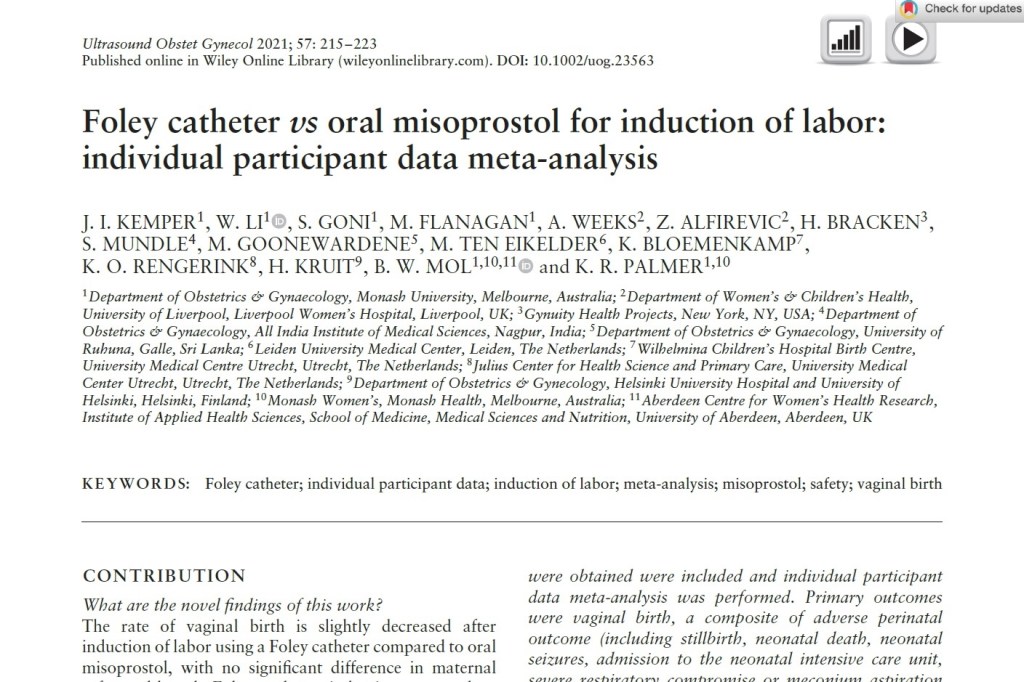 Kemper, J I et al. “Foley catheter vs oral misoprostol for induction of labor: individual participant data meta-analysis.” Ultrasound in obstetrics & gynecology : the official journal of the International Society of Ultrasound in Obstetrics and Gynecology vol. 57,2 (2021): 215-223.