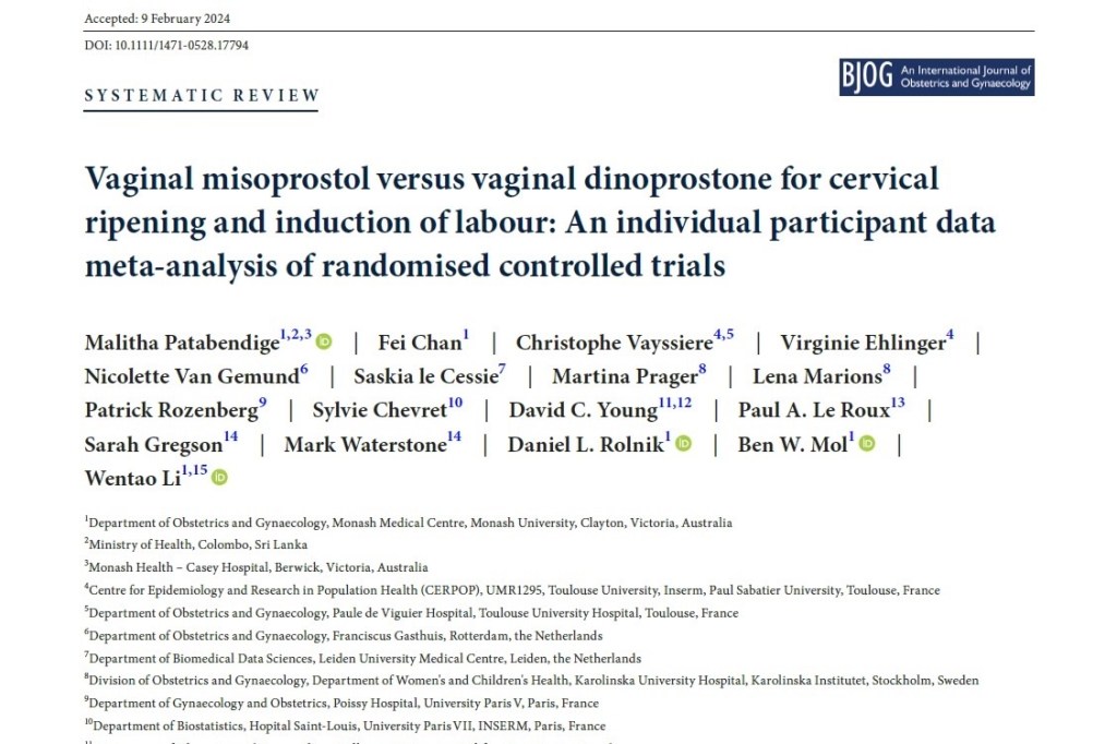 Patabendige, Malitha et al. “Vaginal misoprostol versus vaginal dinoprostone for cervical ripening and induction of labour: An individual participant data meta-analysis of randomised controlled trials.” BJOG : an international journal of obstetrics and gynaecology vol. 131,9 (2024): 1167-1180.