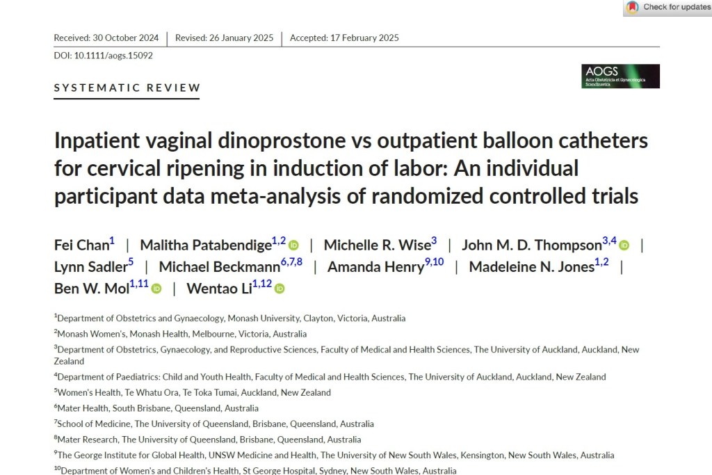 Chan, F et al. “Inpatient vaginal dinoprostone vs outpatient balloon catheters for cervical ripening in induction of labor: an individual participant data meta-analysis of randomized controlled trials.” Acta Obstetricia et Gynecologica Scandinavica (2025): n.p.
