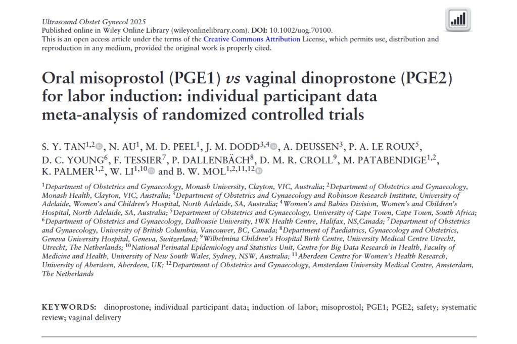 Tan, S Y et al. “Oral misoprostol (PGE1) vs vaginal dinoprostone (PGE2) for labor induction: individual participant data meta-analysis of randomized controlled trials.” Ultrasound in obstetrics & gynecology : the official journal of the International Society of Ultrasound in Obstetrics and Gynecology, 10.1002/uog.70100. 8 Nov. 2025, doi:10.1002/uog.70100