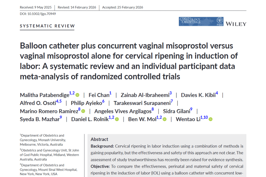 Patabendige, Malitha et al. “Balloon catheter plus concurrent vaginal misoprostol versus vaginal misoprostol alone for cervical ripening in induction of labor: A systematic review and an individual participant data meta-analysis of randomized controlled trials.” International journal of gynaecology and obstetrics: the official organ of the International Federation of Gynaecology and Obstetrics, 10.1002/ijgo.70949. 12 Mar. 2026, doi:10.1002/ijgo.70949